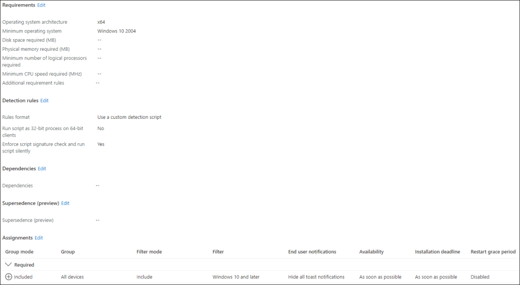 - Import the applyLocalGPO.intunewin file and create the app with the following properties. The Detection script and filter “Windows 10 and later” are provided at the end of the post