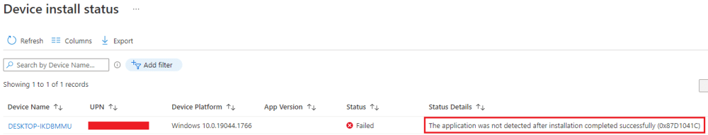 To really see which devices had an actual script failure you can click on Device status and filter out Success and return code 0x87D1041C (which means Install completed but detection failed, which is expected). This will leave devices with failures to investigate.